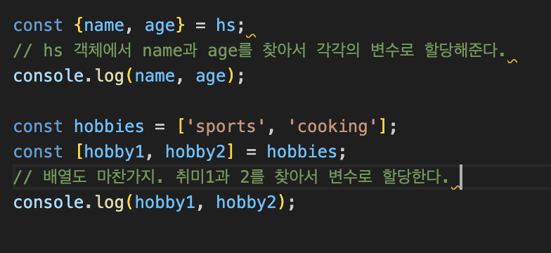 {} 를 활용하면 객체의 특정 키값을 찾아서 할당해준다. name, age, hobby 등